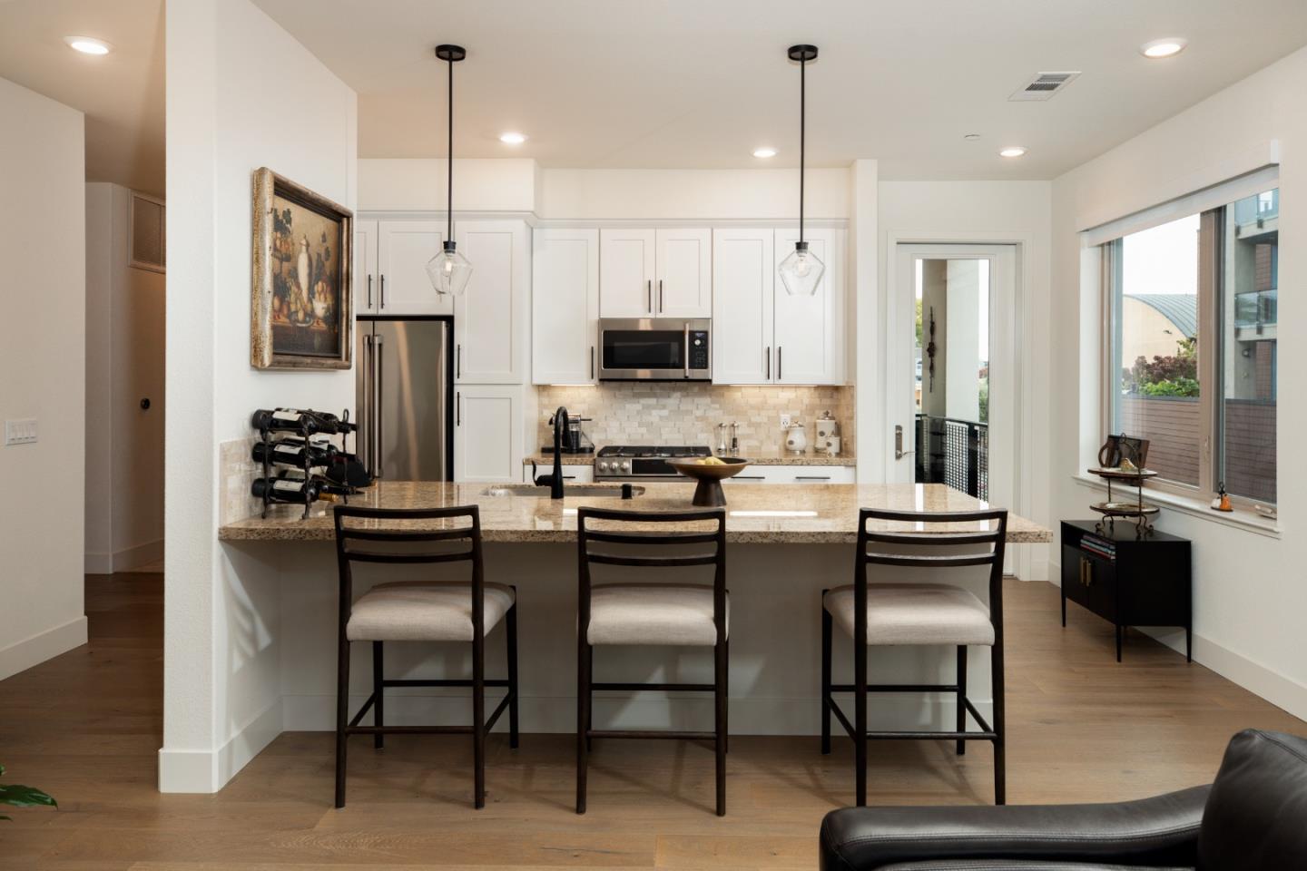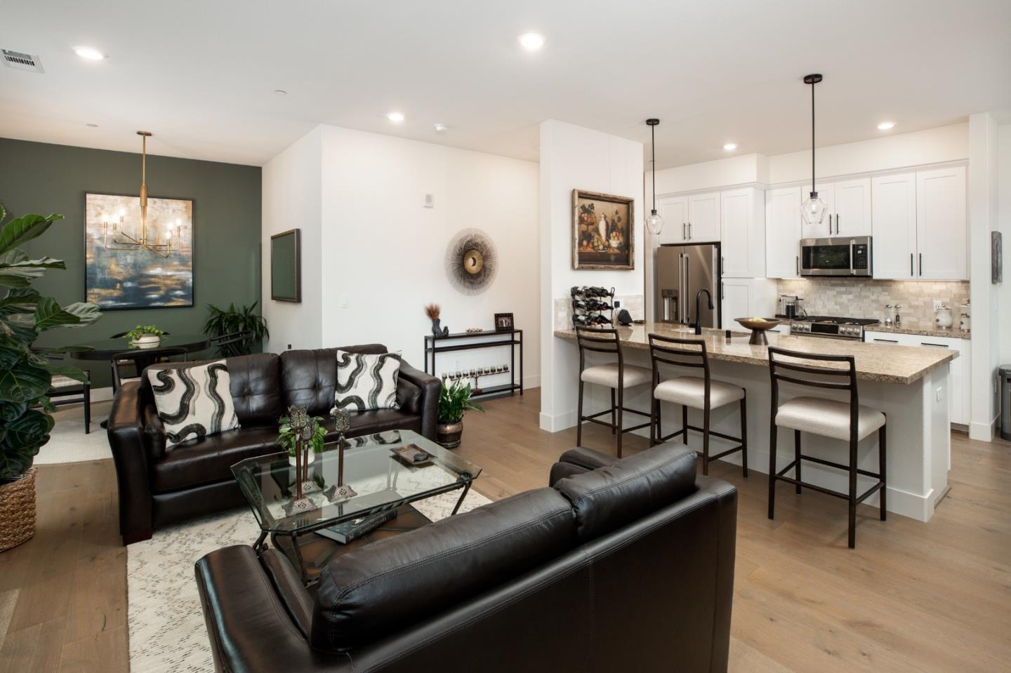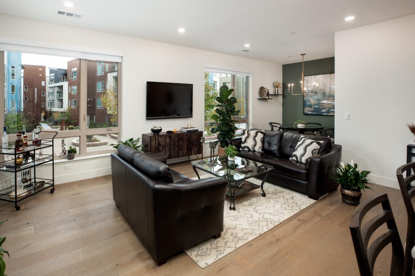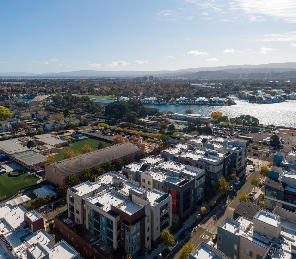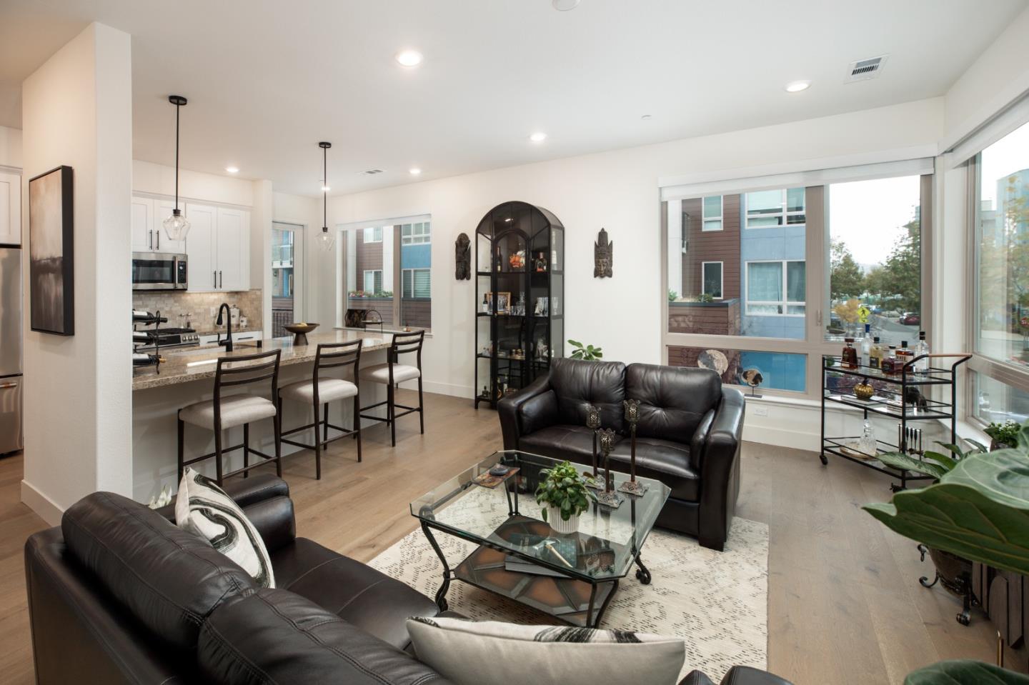 Active 55+ living at Foster Square, a condominium community in the heart of Foster City just steps to everything. This rarely available corner unit was formerly the community model home and is conveniently just off the extra-large elevator. Features include upscale finishes like high-end luxury vinyl floors, oversized windows with electronic blinds, chandelier and recessed lighting, and fine carpet in the bedroom wing. The open concept design is filled with natural light and looks out to two community Art Walks as well as wintertime views reaching out to Foster Citys iconic lagoon. A gourmet kitchen has island counter seating, granite counters, and all stainless steel appliances including a 6-burner gas range. The spacious one-level floor plan has 3 bedrooms and 2 baths with a lovely primary suite that includes a large walk-in closet and en suite bath with curbless shower. A standout feature is the exceptionally large 2-car tandem garage, complete with dual private entrances and extra space for storage, fitness equipment, or even a wine cellar. Every amenity surrounds this home, from cafes to restaurants, myriad social and fitness activities, as well as the library and boating on the lagoon.