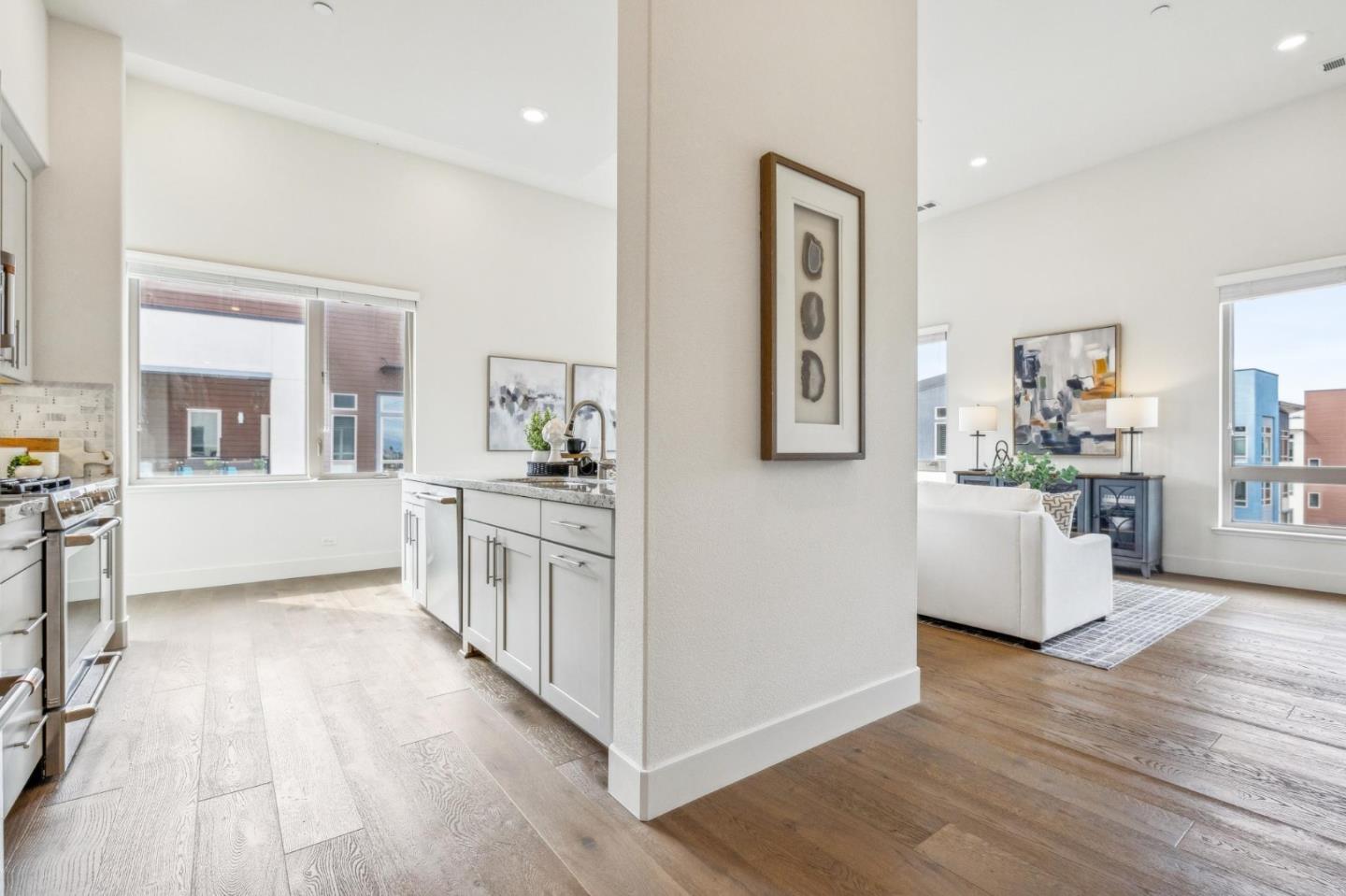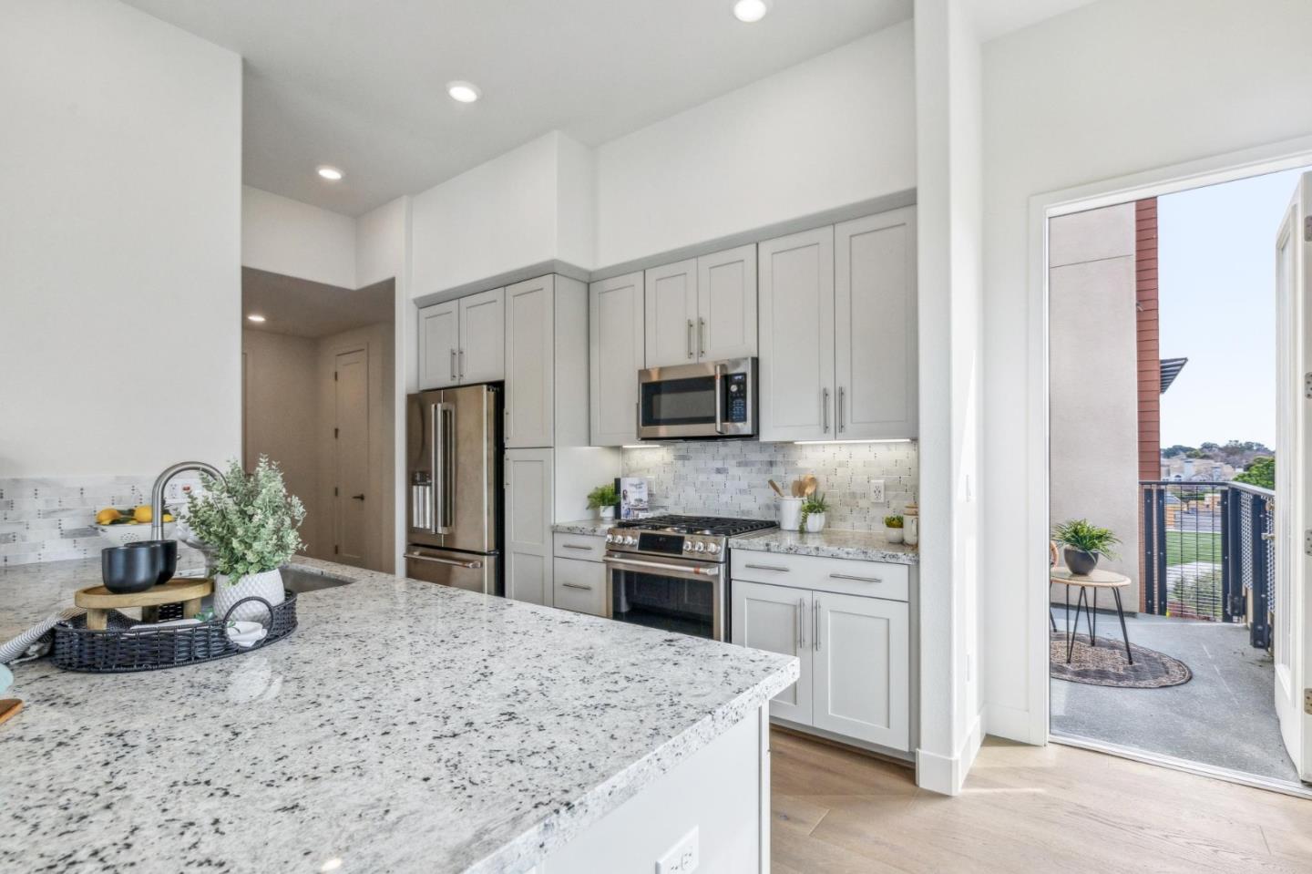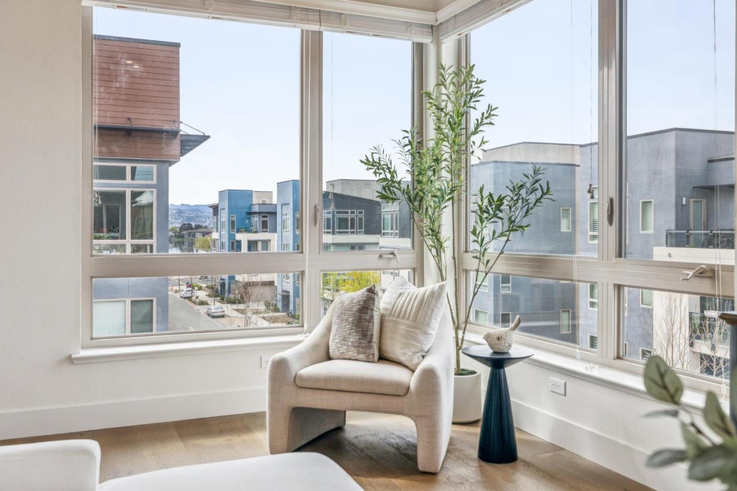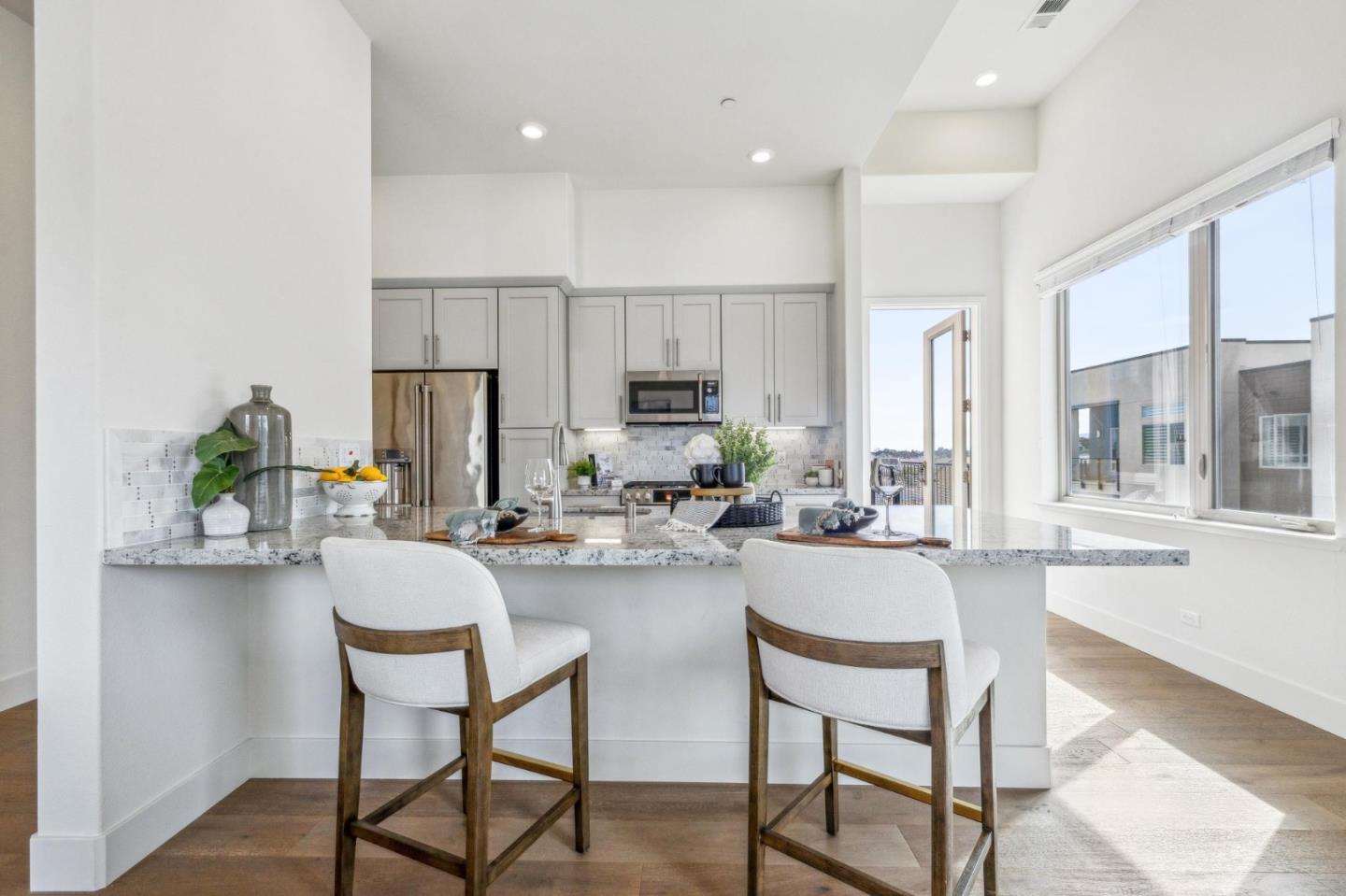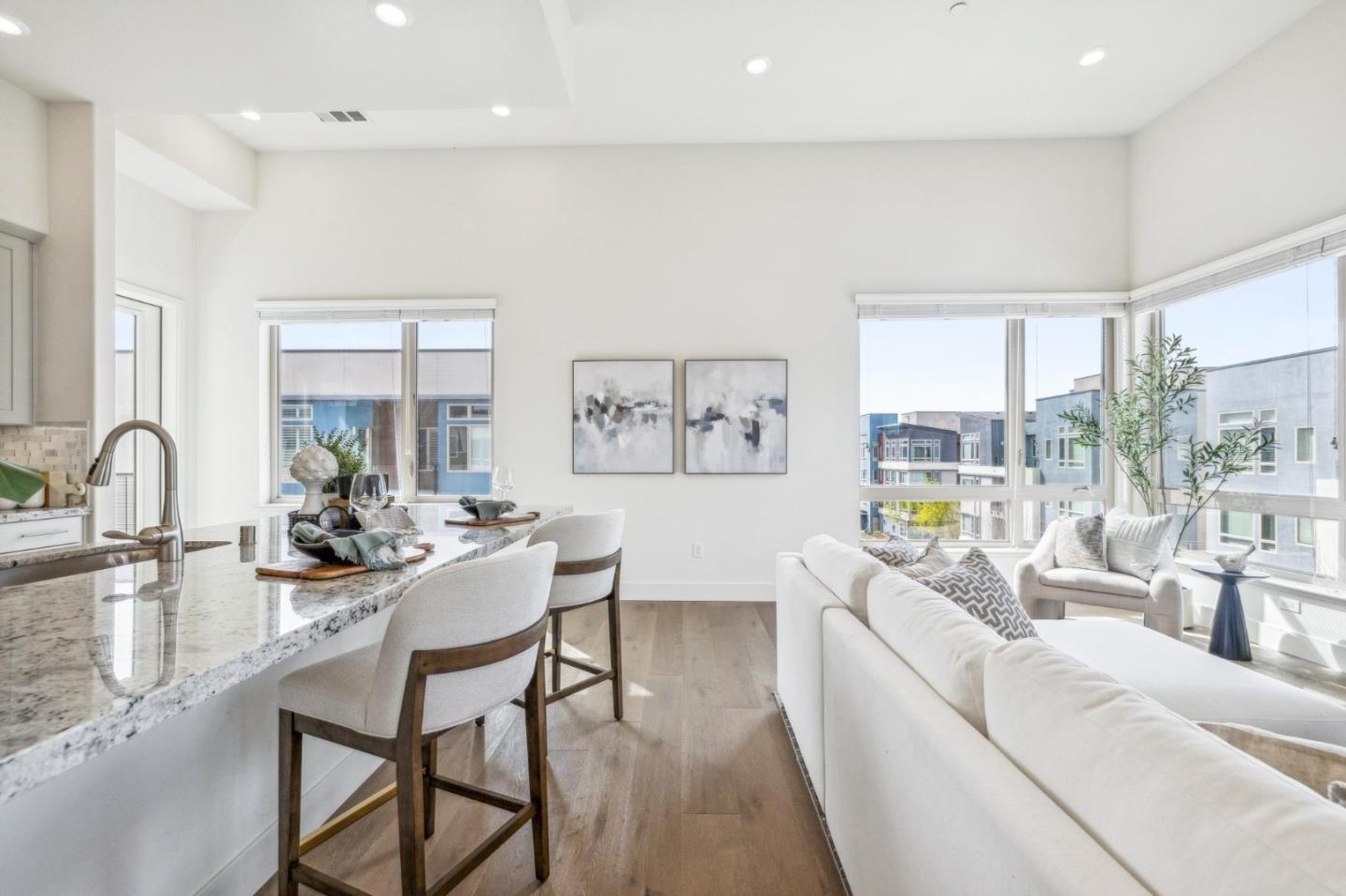Rarely available top-floor corner unit at Foster Square, an active 55+ living community in the heart of Foster City just steps to everything. It features a lagoon water view and wonderful finishes including engineered wood floors, carpeted bedrooms, oversized windows, and recessed lighting. The high ceiling and open concept design are filled with natural light and has a wonderful private patio for fresh-air living. A gourmet kitchen has island counter seating, granite counters, and all stainless steel upscale appliances including a gas range. The spacious one-level floor plan has 3 bedrooms and 2 baths with a lovely primary suite that includes a large walk-in closet and en suite bath with curbless shower. Every amenity surrounds this home, from cafes to restaurants, grocery store to postal office, myriad social and fitness activities, as well as the library, community recreation center, and boating on the lagoon.