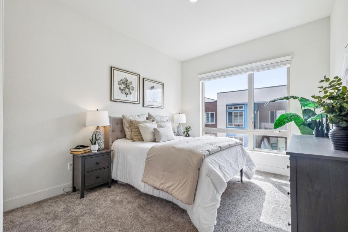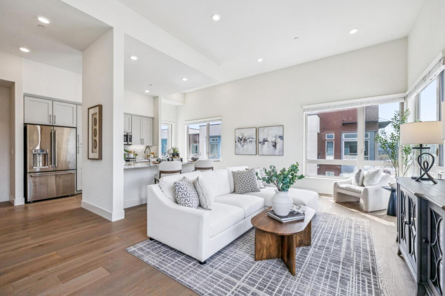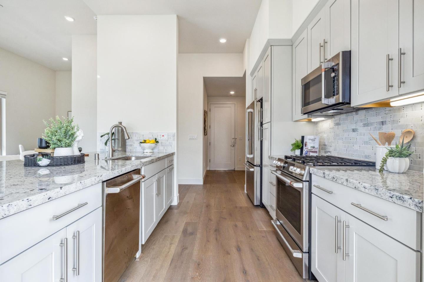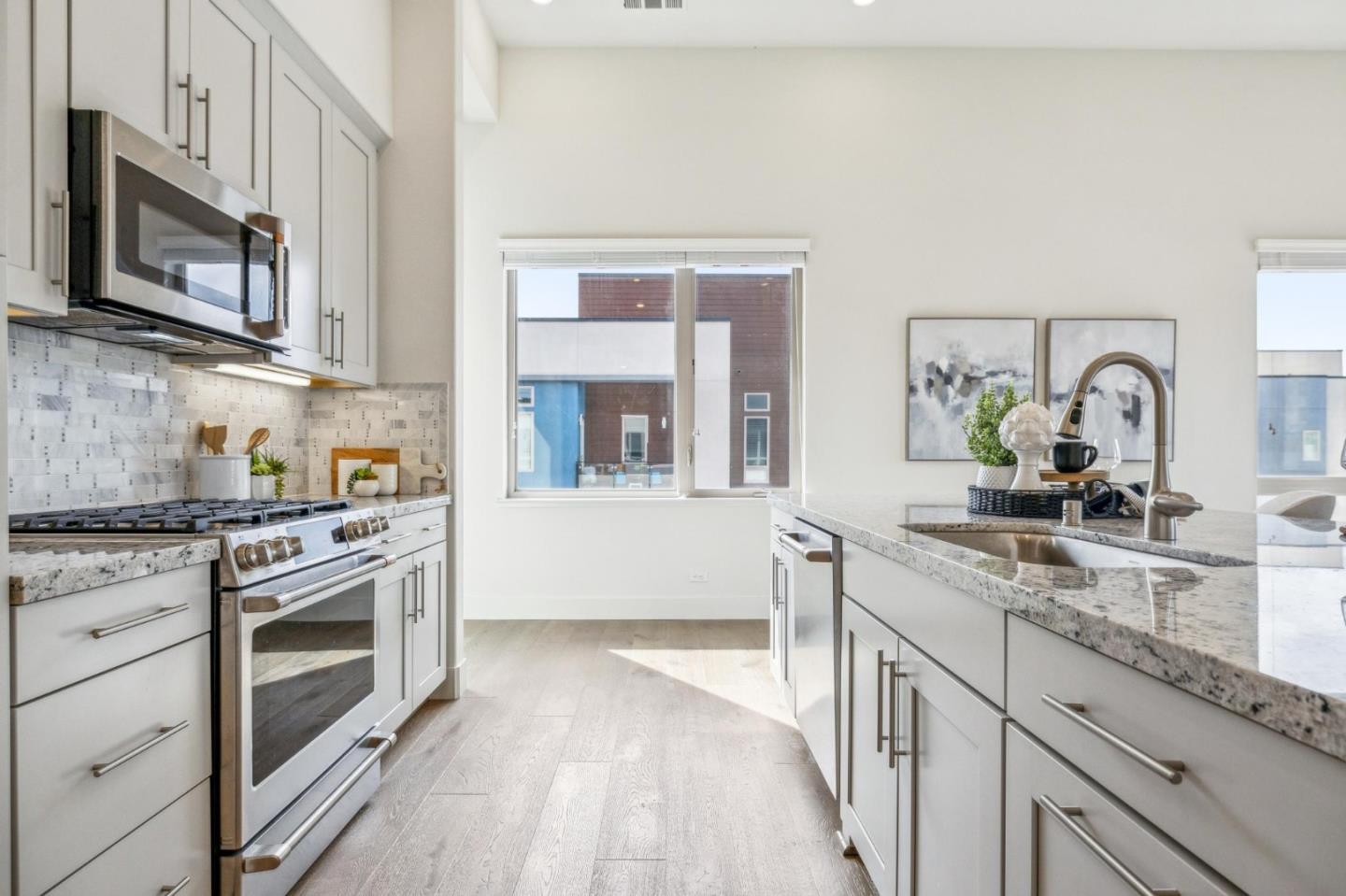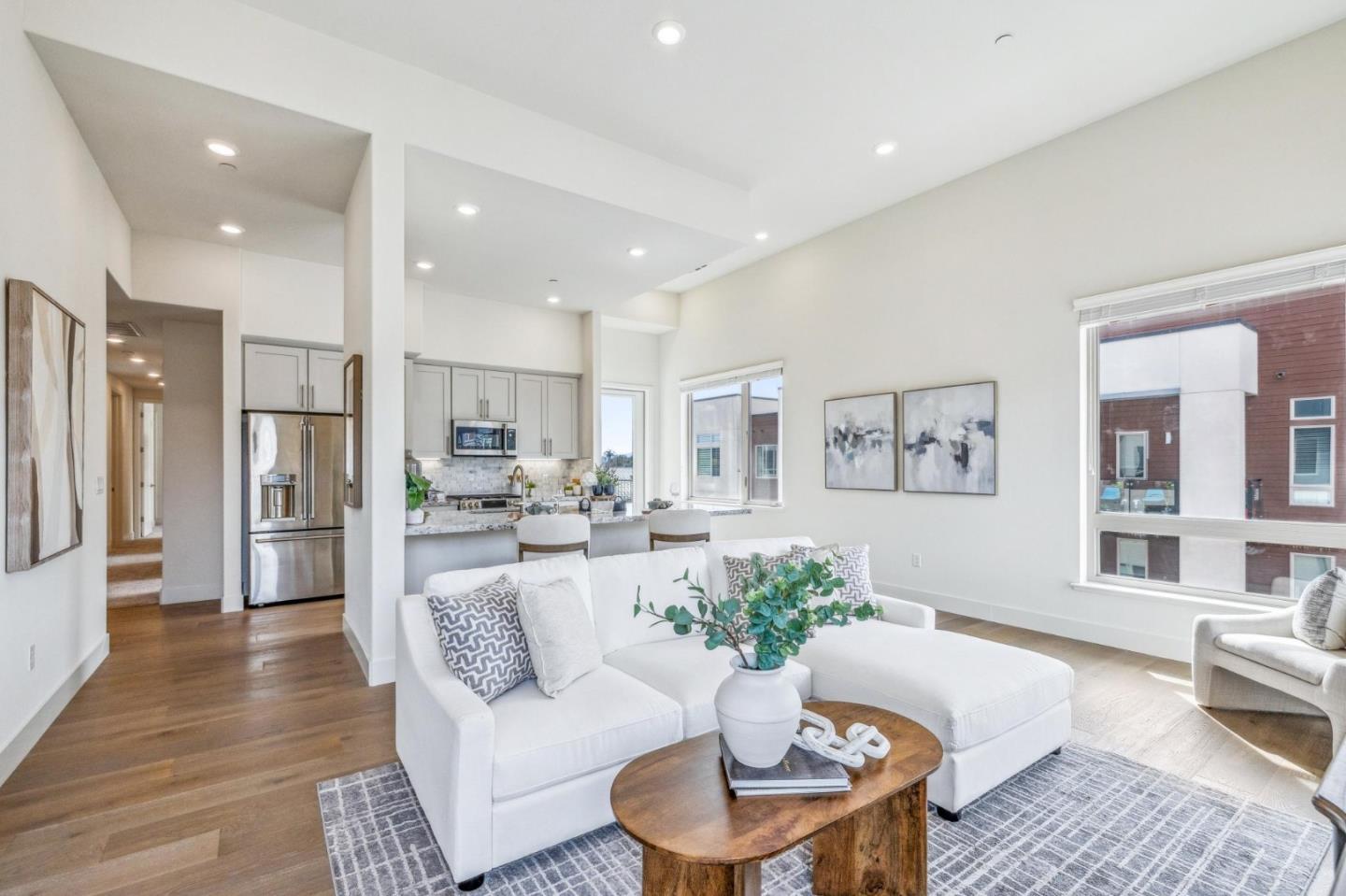 Rarely available top-floor corner unit at Foster Square, an active 55+ living community in the heart of Foster City just steps to everything. It features a lagoon water view and wonderful finishes including engineered wood floors, carpeted bedrooms, oversized windows, and recessed lighting. The high ceiling and open concept design are filled with natural light and has a wonderful private patio for fresh-air living. A gourmet kitchen has island counter seating, granite counters, and all stainless steel upscale appliances including a gas range. The spacious one-level floor plan has 3 bedrooms and 2 baths with a lovely primary suite that includes a large walk-in closet and en suite bath with curbless shower. Every amenity surrounds this home, from cafes to restaurants, grocery store to postal office, myriad social and fitness activities, as well as the library, community recreation center, and boating on the lagoon.