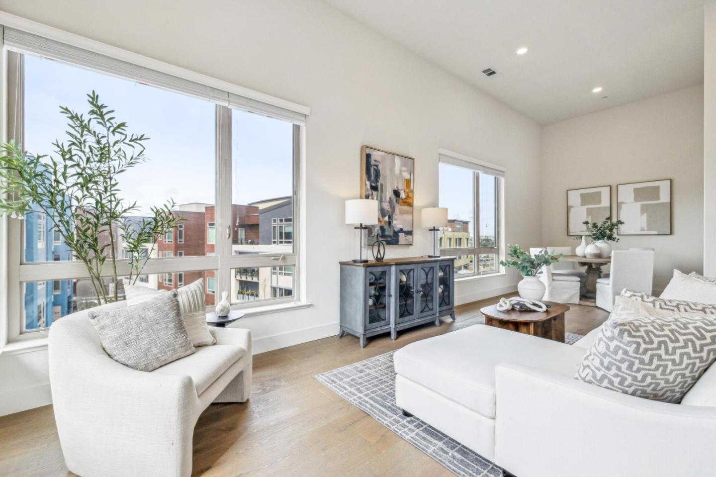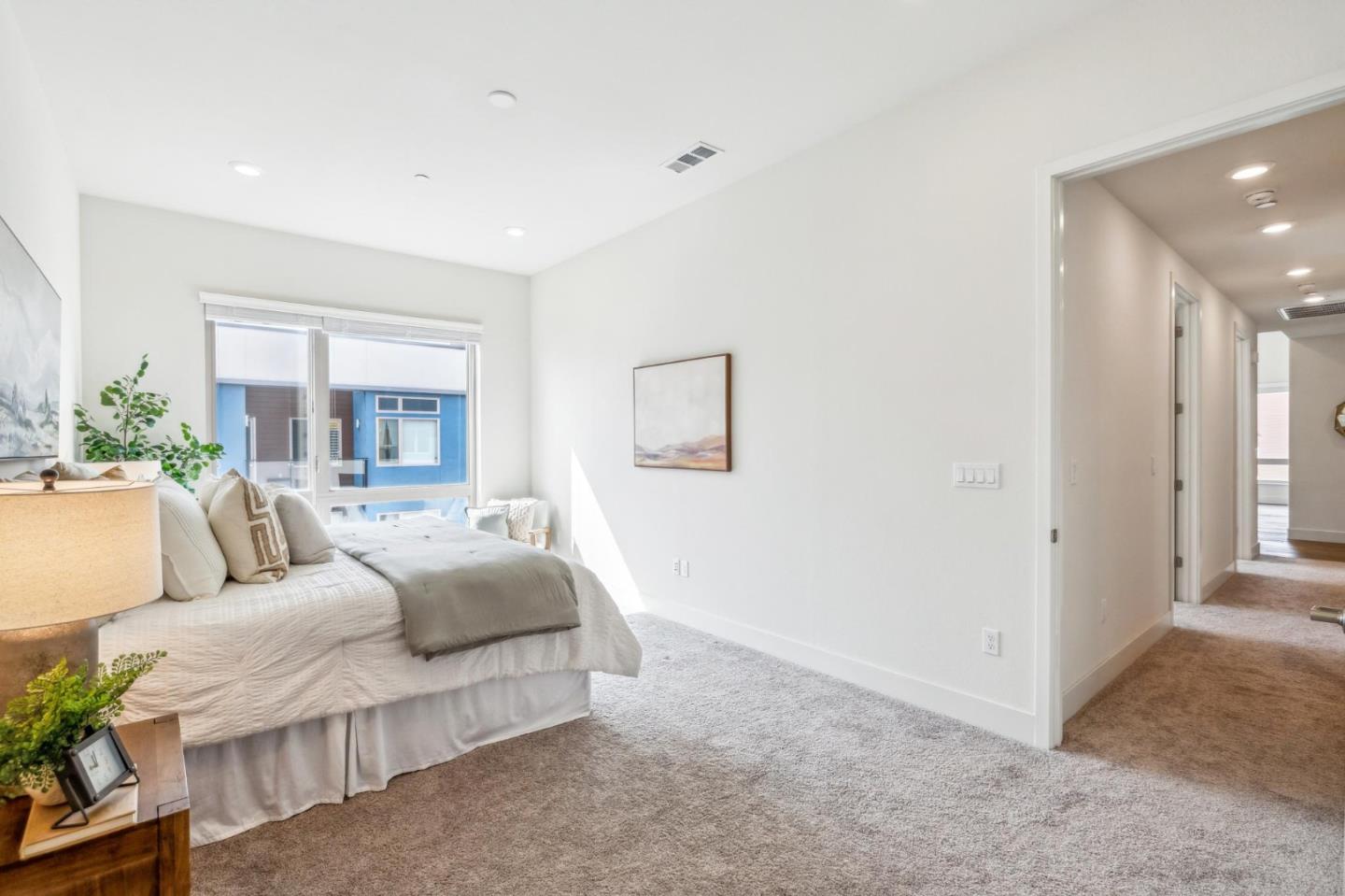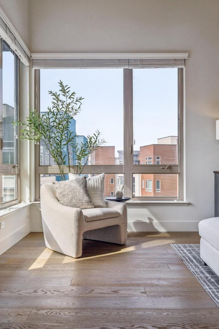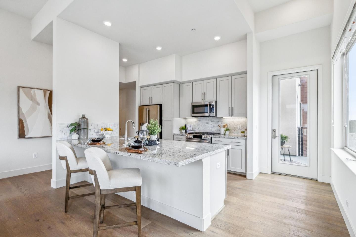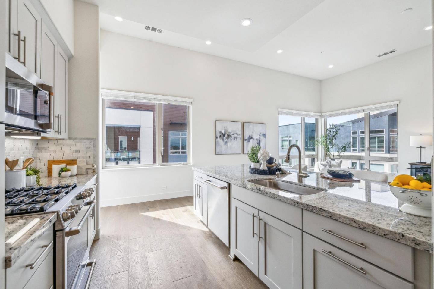 Rarely available top-floor corner unit at Foster Square, an active 55+ living community in the heart of Foster City just steps to everything. It features a lagoon water view and wonderful finishes including engineered wood floors, carpeted bedrooms, oversized windows, and recessed lighting. The high ceiling and open concept design are filled with natural light and has a wonderful private patio for fresh-air living. A gourmet kitchen has island counter seating, granite counters, and all stainless steel upscale appliances including a gas range. The spacious one-level floor plan has 3 bedrooms and 2 baths with a lovely primary suite that includes a large walk-in closet and en suite bath with curbless shower. Every amenity surrounds this home, from cafes to restaurants, grocery store to postal office, myriad social and fitness activities, as well as the library, community recreation center, and boating on the lagoon.