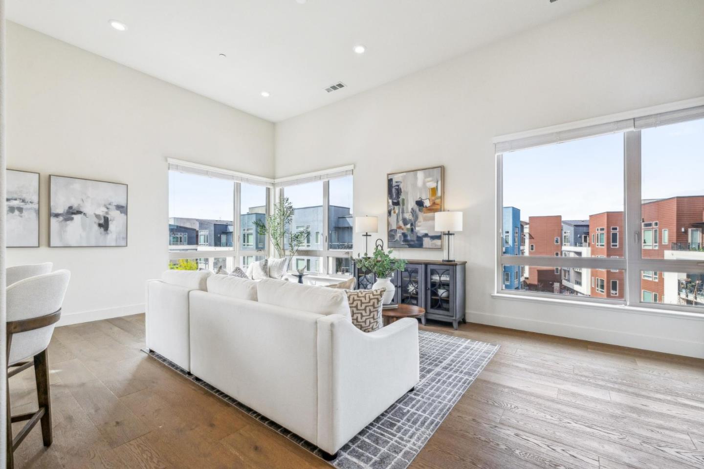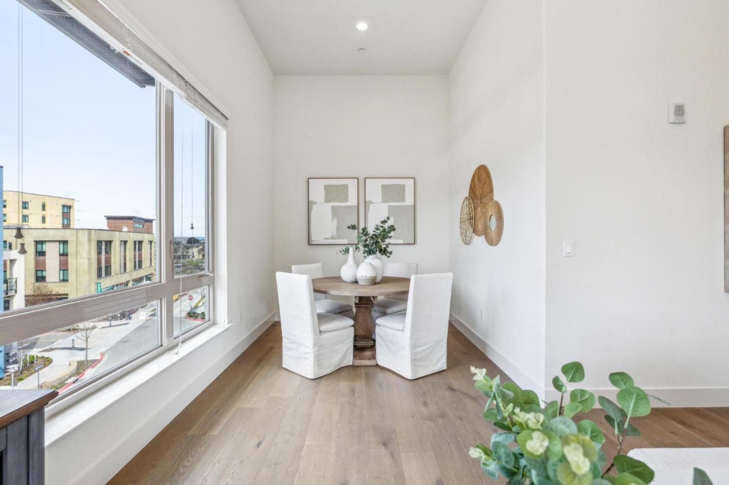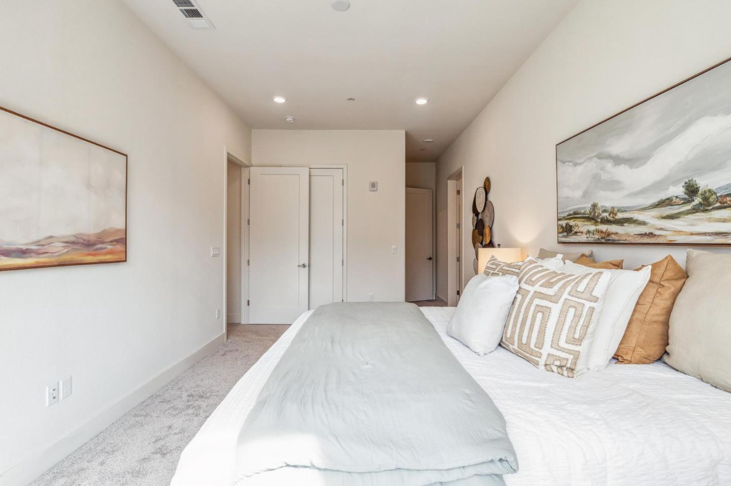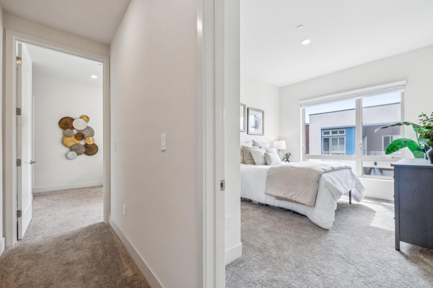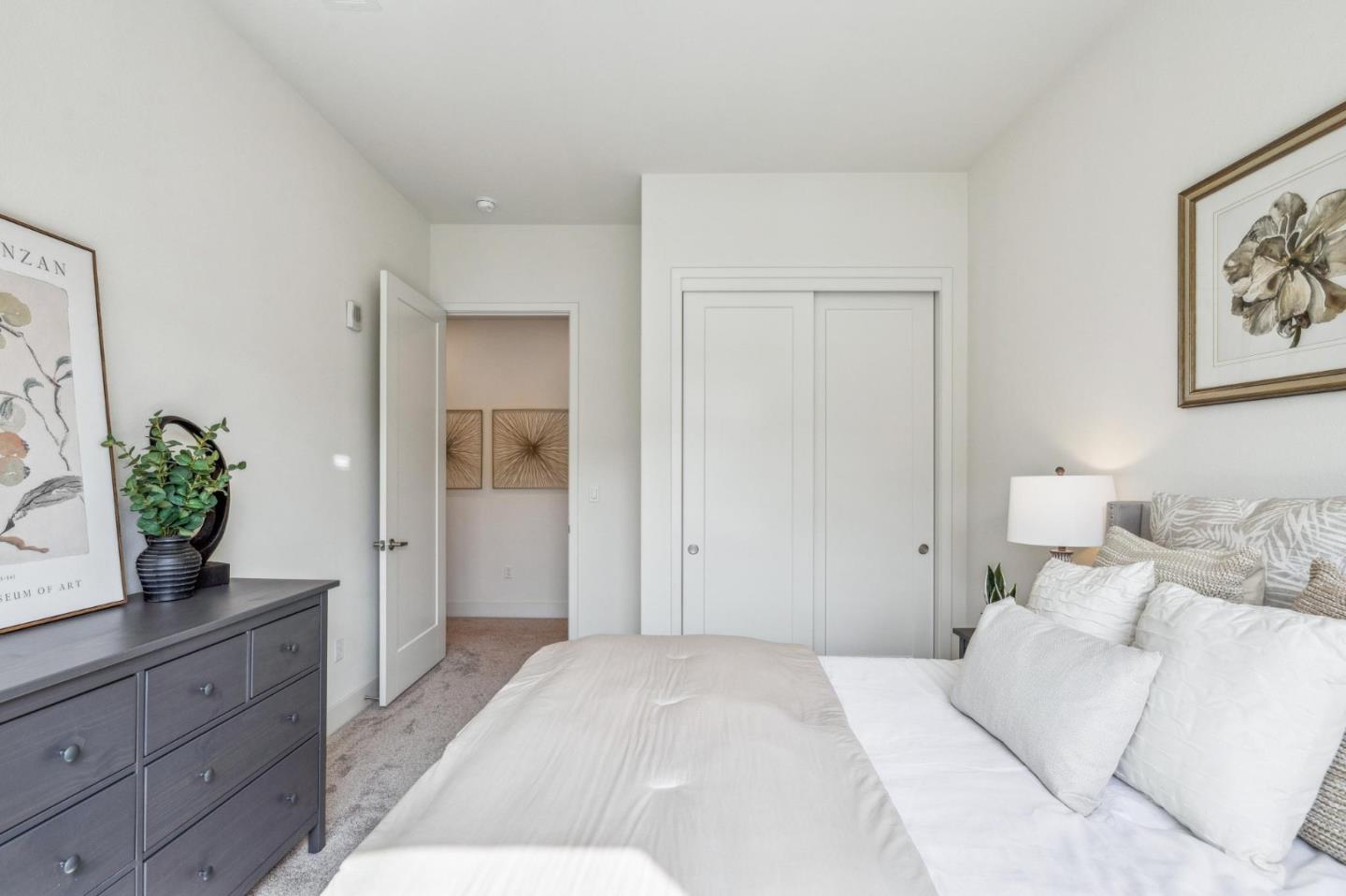 Rarely available top-floor corner unit at Foster Square, an active 55+ living community in the heart of Foster City just steps to everything. It features a lagoon water view and wonderful finishes including engineered wood floors, carpeted bedrooms, oversized windows, and recessed lighting. The high ceiling and open concept design are filled with natural light and has a wonderful private patio for fresh-air living. A gourmet kitchen has island counter seating, granite counters, and all stainless steel upscale appliances including a gas range. The spacious one-level floor plan has 3 bedrooms and 2 baths with a lovely primary suite that includes a large walk-in closet and en suite bath with curbless shower. Every amenity surrounds this home, from cafes to restaurants, grocery store to postal office, myriad social and fitness activities, as well as the library, community recreation center, and boating on the lagoon.