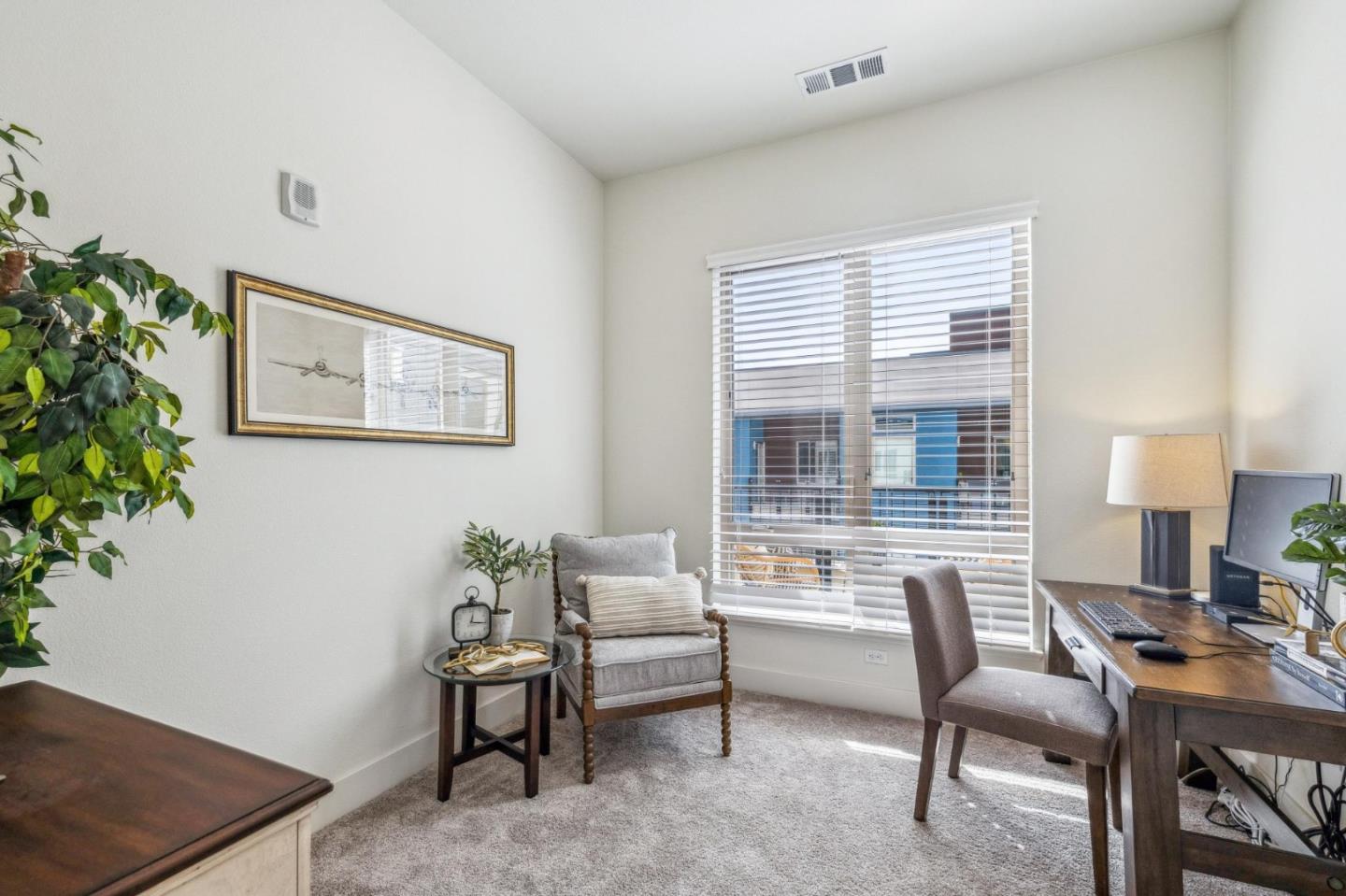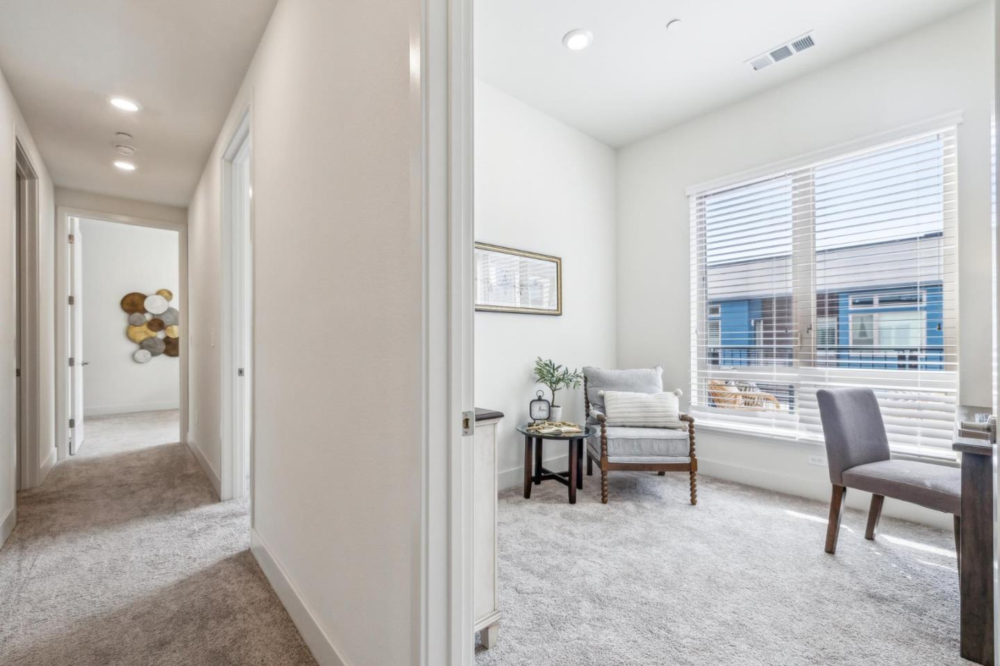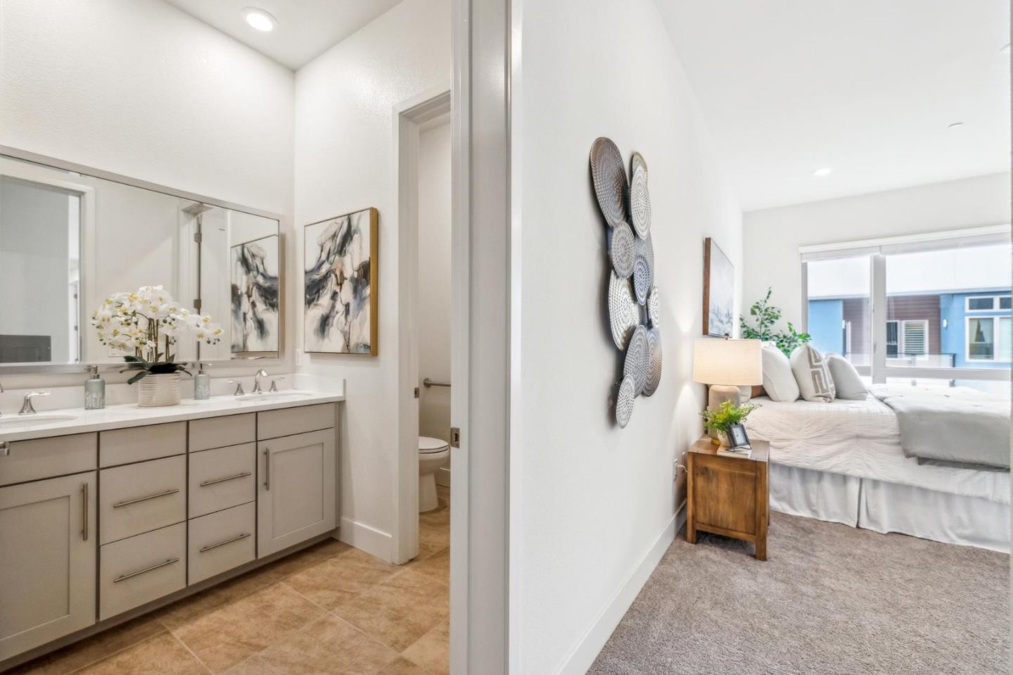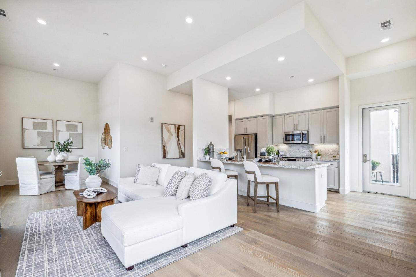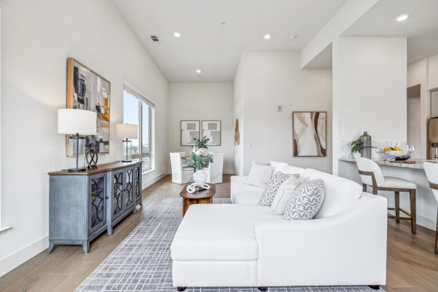 Rarely available top-floor corner unit at Foster Square, an active 55+ living community in the heart of Foster City just steps to everything. It features a lagoon water view and wonderful finishes including engineered wood floors, carpeted bedrooms, oversized windows, and recessed lighting. The high ceiling and open concept design are filled with natural light and has a wonderful private patio for fresh-air living. A gourmet kitchen has island counter seating, granite counters, and all stainless steel upscale appliances including a gas range. The spacious one-level floor plan has 3 bedrooms and 2 baths with a lovely primary suite that includes a large walk-in closet and en suite bath with curbless shower. Every amenity surrounds this home, from cafes to restaurants, grocery store to postal office, myriad social and fitness activities, as well as the library, community recreation center, and boating on the lagoon.