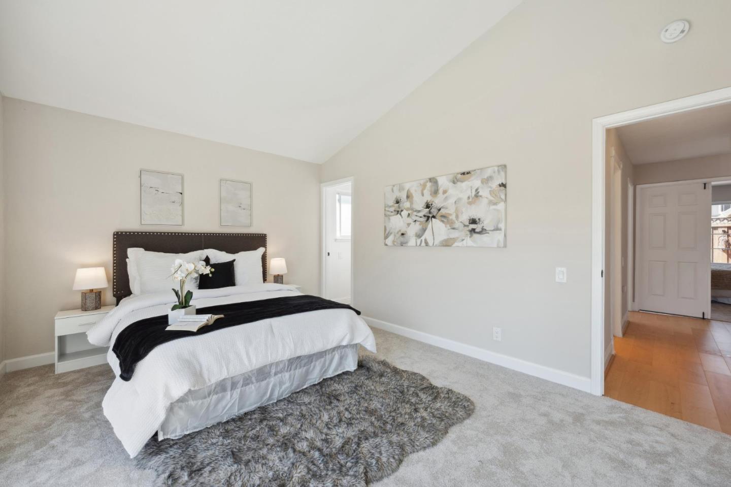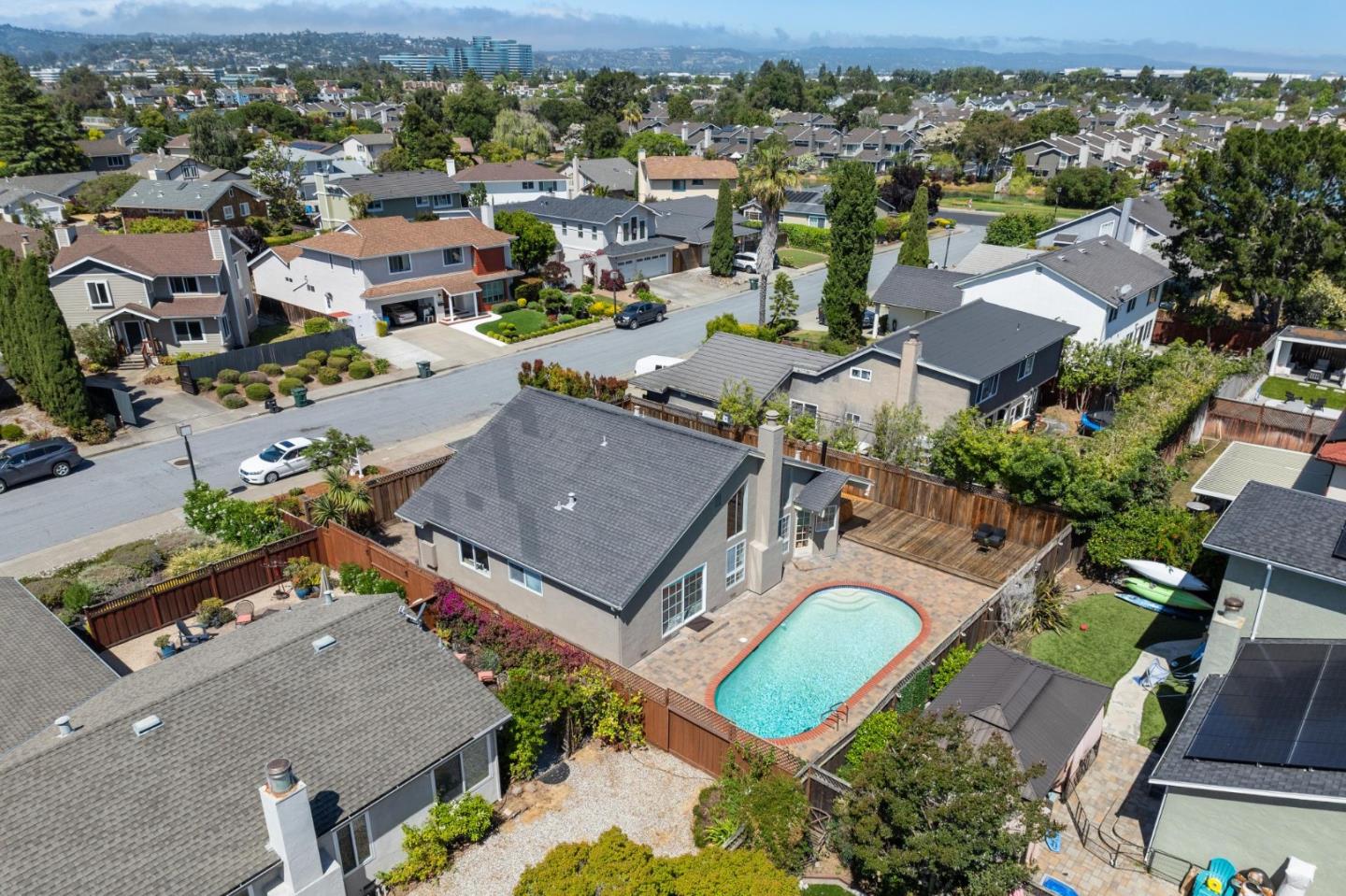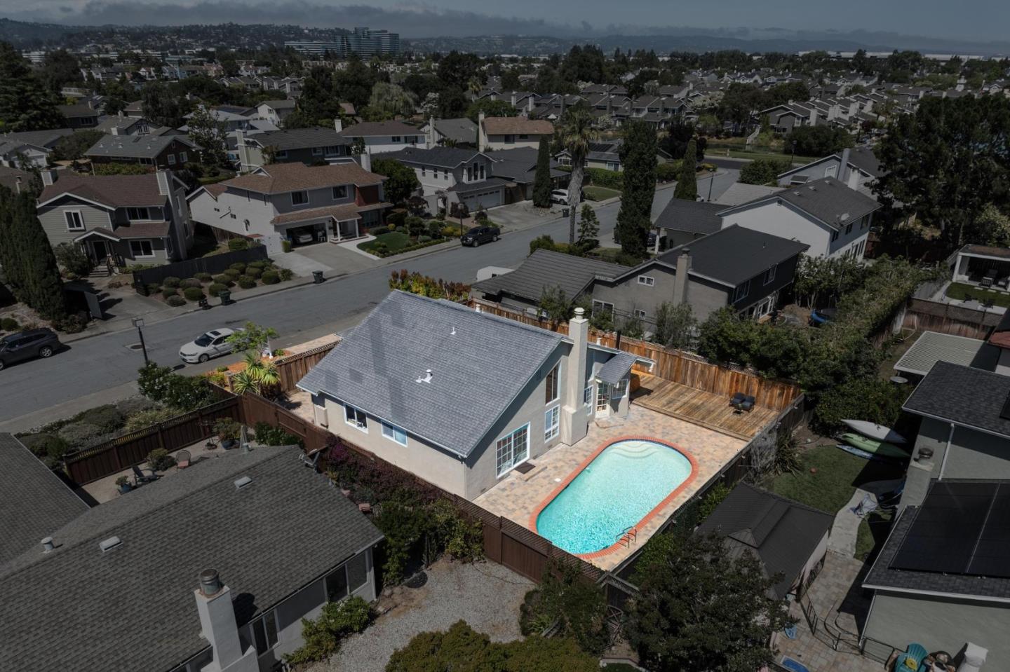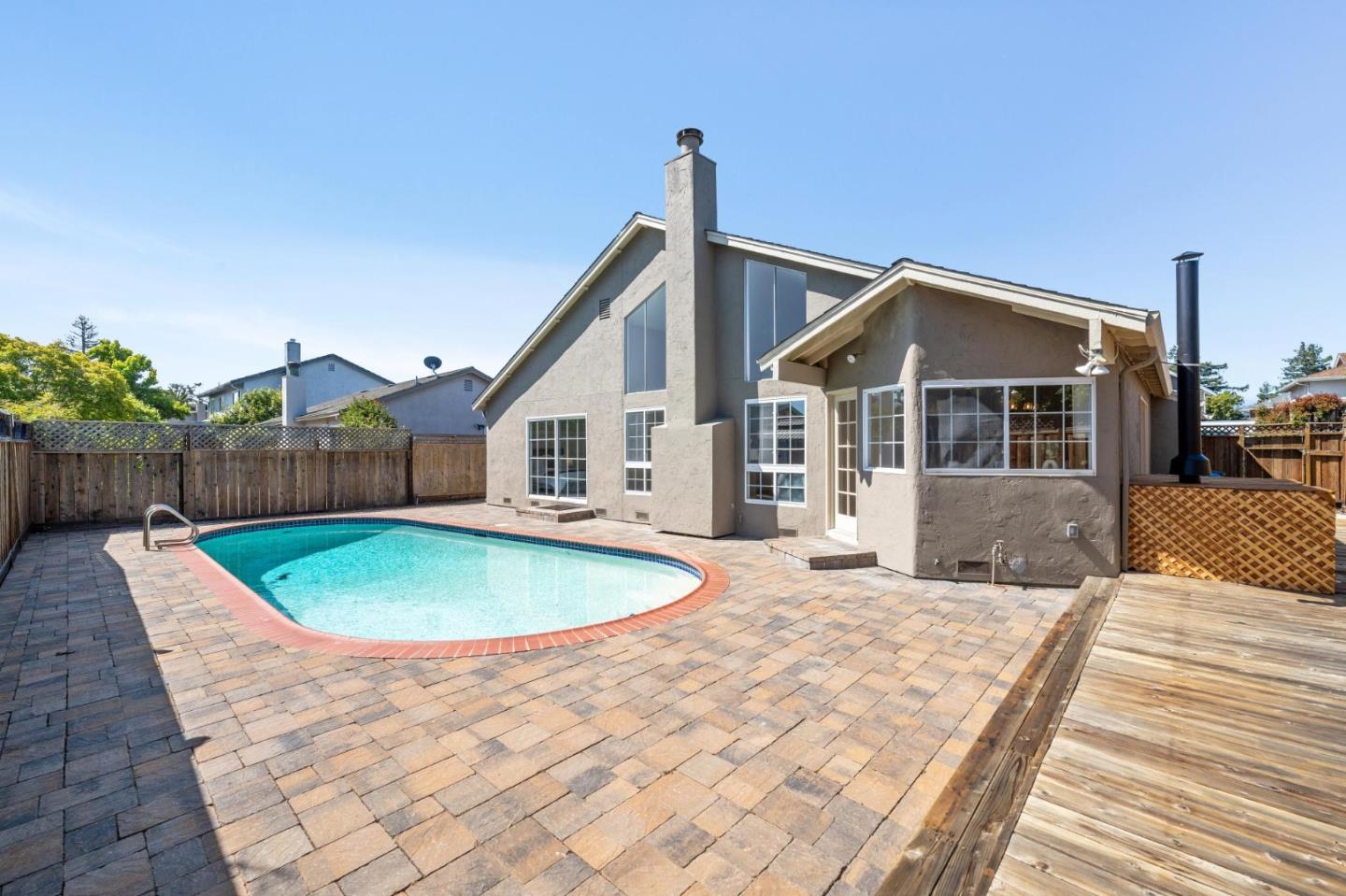 Centrally located on the Mid-Peninsula between San Francisco Bay waterways is an updated home with a dramatic living room, brand new kitchen, stylishly updated bathrooms, private family room and grounds with a pool, deck and paver patios and driveway. Drama begins at the foyer with a striking view of the living room with cathedral ceiling, focal-point fireplace and floor-to-ceiling windows with views of the sparkling pool. Softly hued walls, white doors and trim, black hardware, wood laminate flooring and plush carpeting create the backdrop for grand living spaces, lovely entertaining venues and private bedroom retreats, including a primary with sliding doors to the back patio. Updated kitchen and bathrooms feature new cabinets, fixtures, appliances, French and sliding glass doors, and tony stone and tile surfaces. An open dining area extends to a large deck, and the loft/family room provides a great space for family fun or a private office. Near Marlin Park, Nob Hill and the Bay Club.